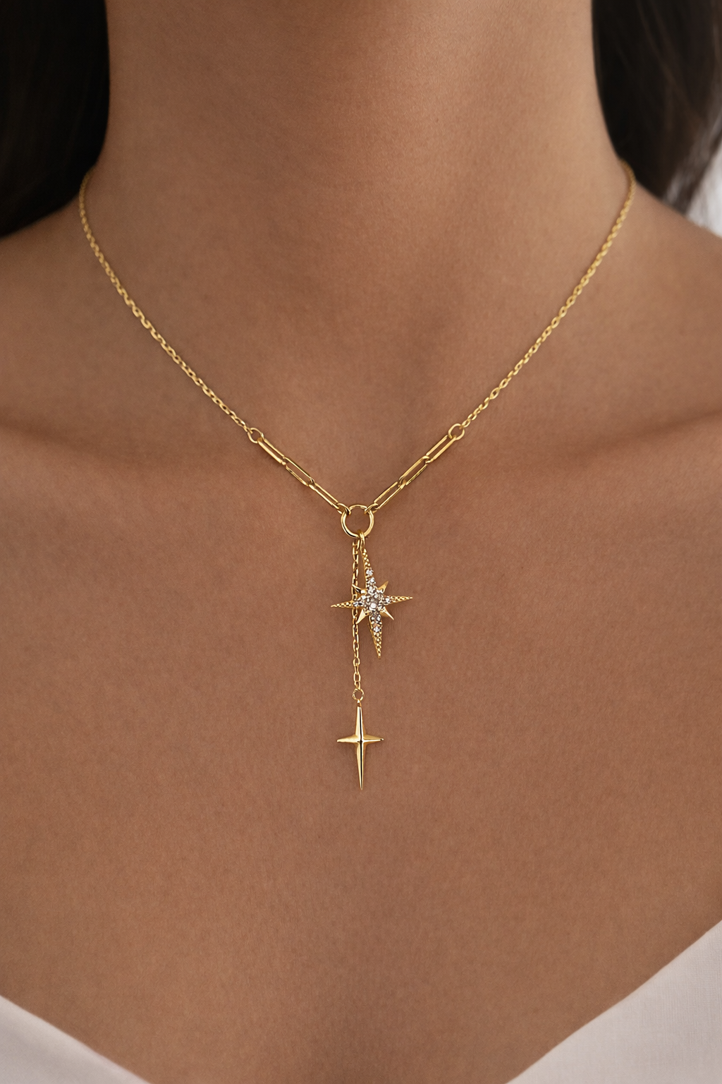 İkili Kutup Yıldızı Sallantılı Gold Kolye